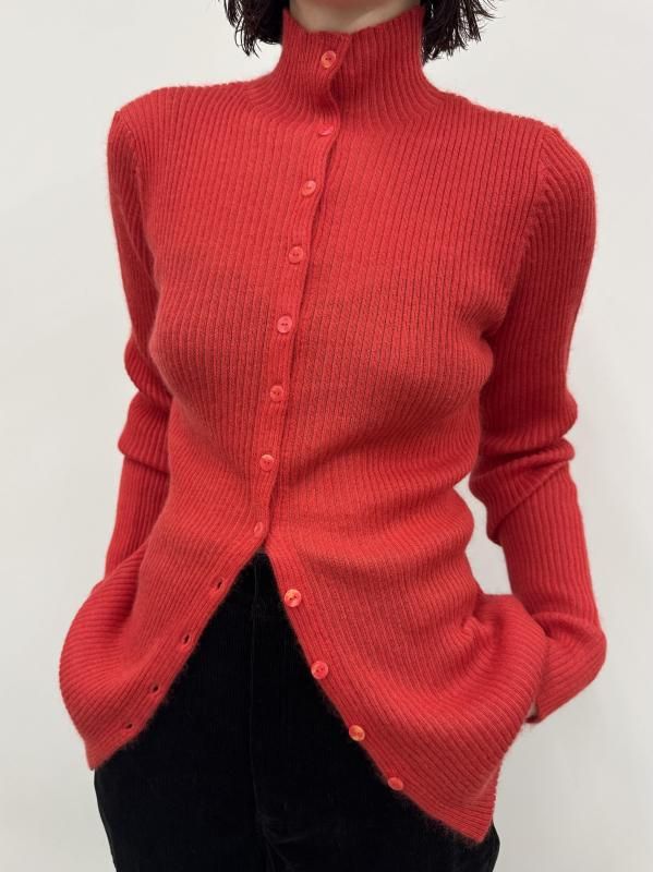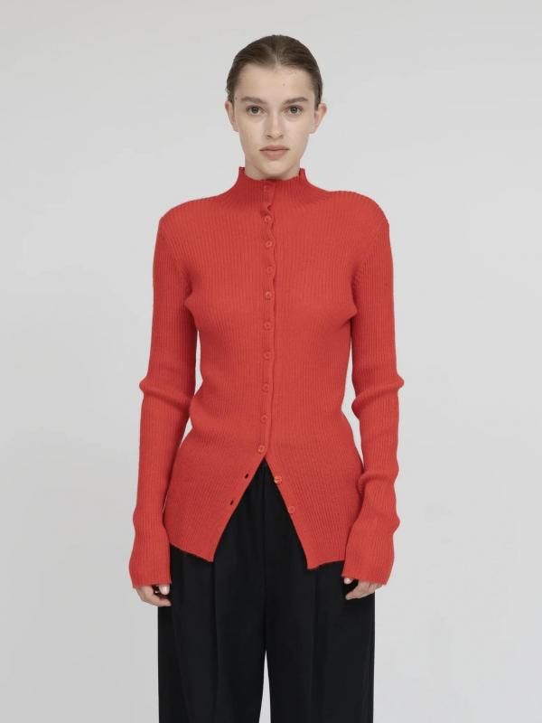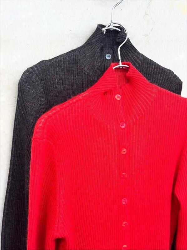 モヘアとシルクをブレンドすることによって、肌あたりのよい仕上がりに。長めに設定された着丈とフロントにあしらった同色の釦がアクセントとなり、汎用性にも優れた一着に。