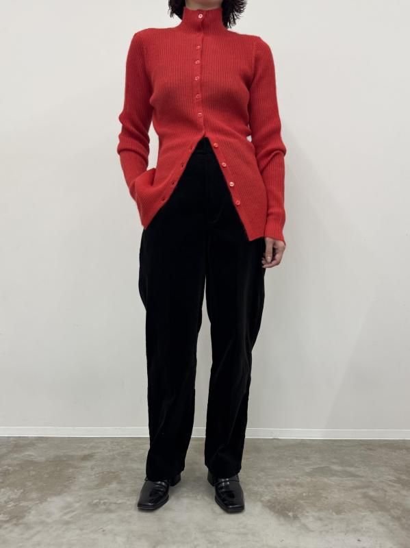 モヘアシルクの糸を使用したリブ編みのニットカーディガン。