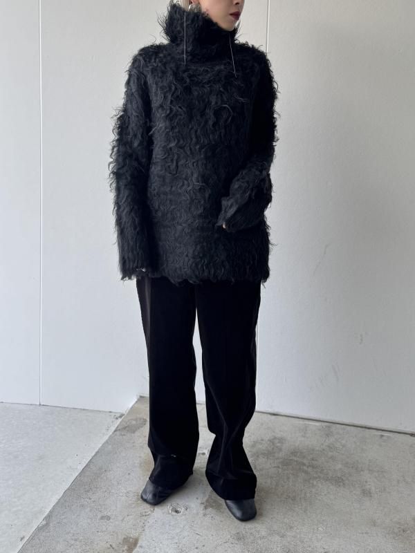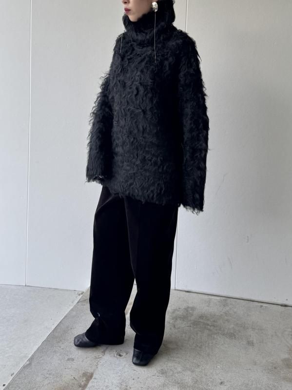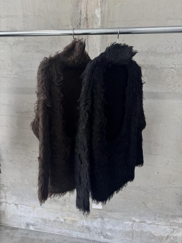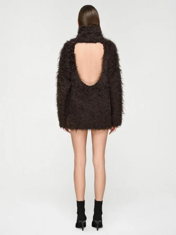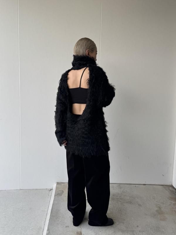 アイコニックなオープンバックデザインのニットは、毛足の長いシャギーでボリュームのある表情感に仕上げている。