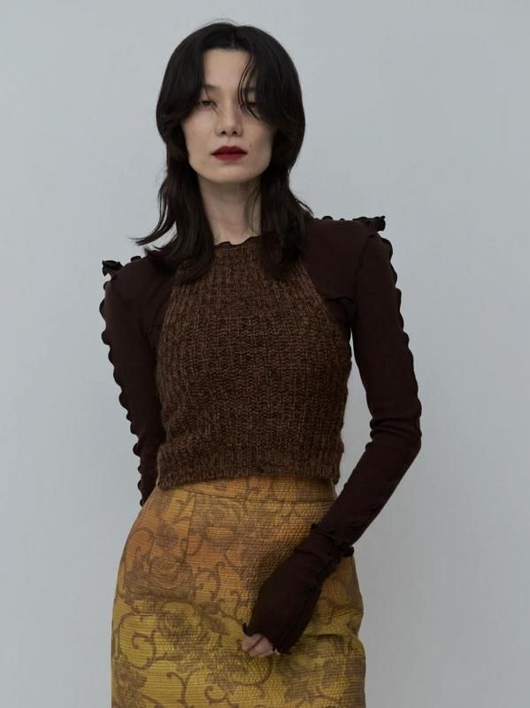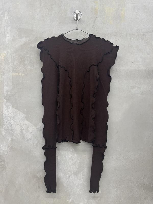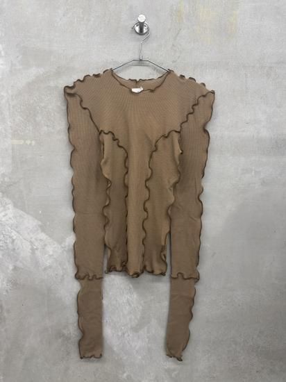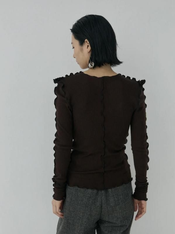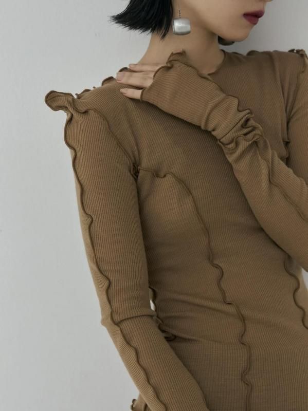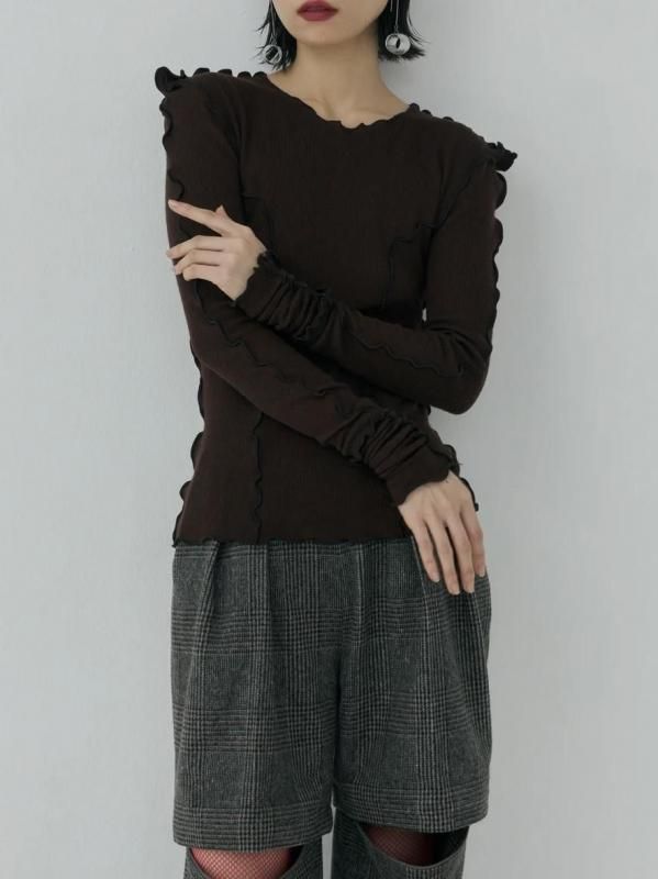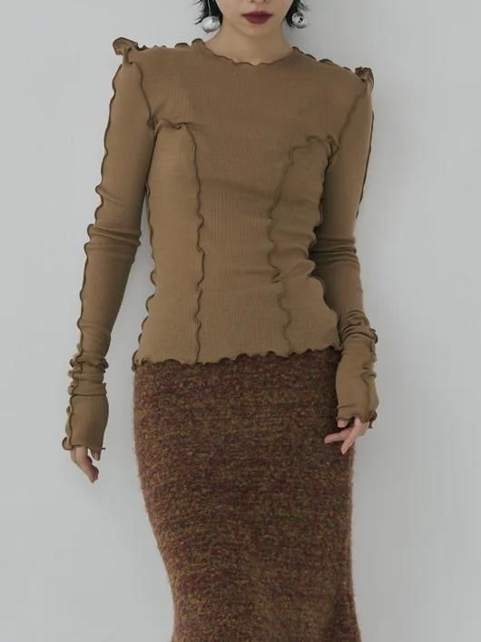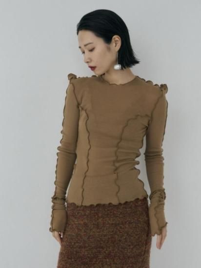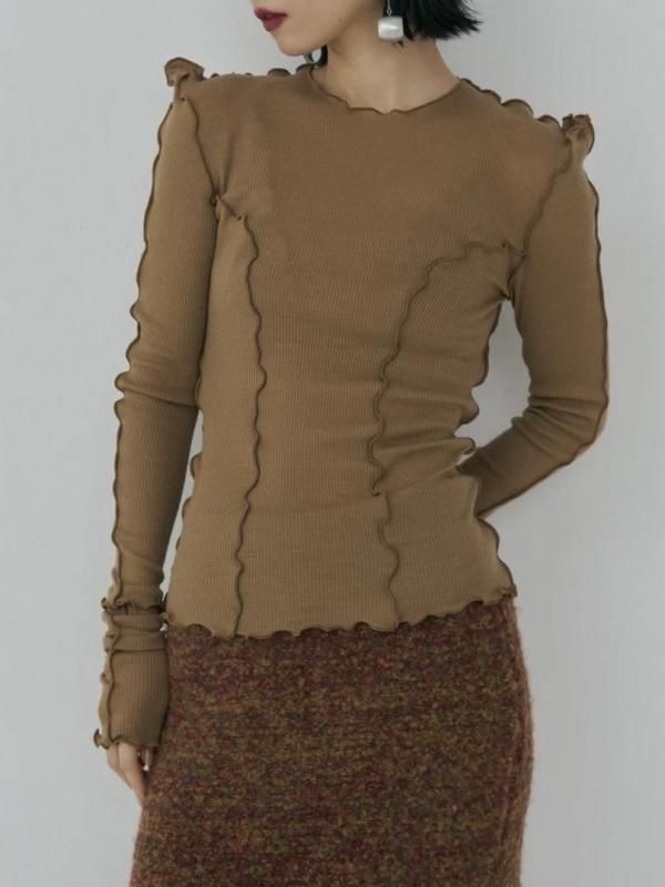 メローステッチで縁取りし、長めの袖とツンと尖る肩が印象的なデザイン。 しなやかな肌触りで心地よくフィット。