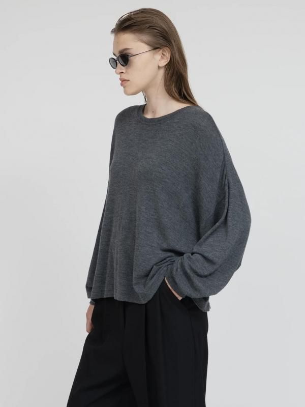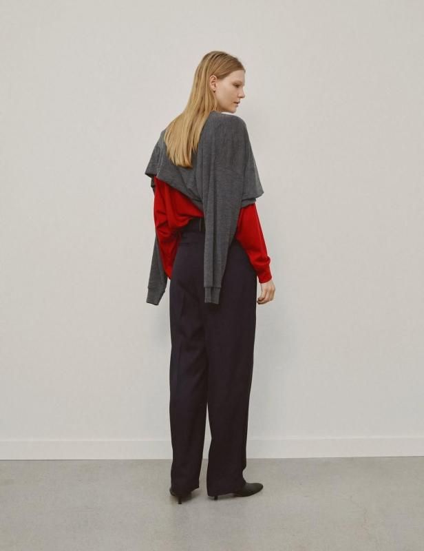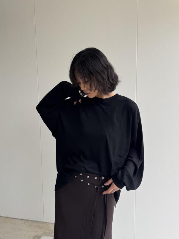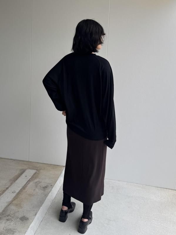 上品な光沢と流れるようなドレープ、絶妙に詰まらせたネックラインにルーズなシルエットを組み合わせ、カジュアルながらも清潔感のある佇まいに仕上げている。