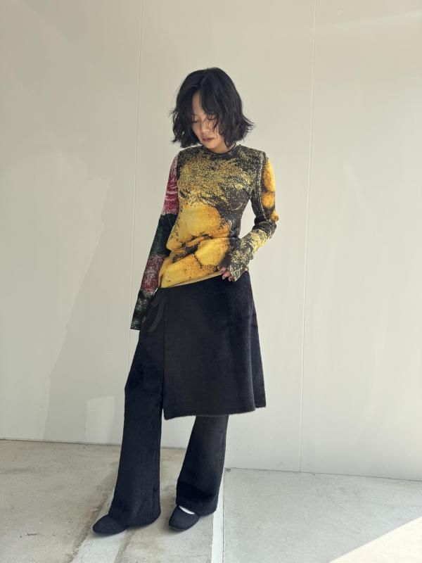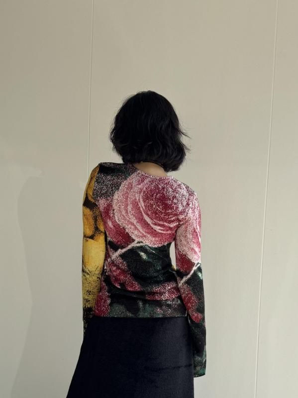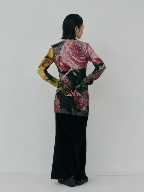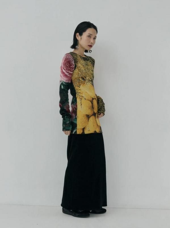 それぞれのモチーフは距離を取る事でより鮮明に浮かび上がります。 庭に実った柚子が木から落ち、器に集めらた様子が愛らしかったので写真に納めたものと、きゅっと詰まった花びらを力強く咲かせた椿の生命力を切り取りました。ビビットな色合いで雰囲気のあるプルオーバー。