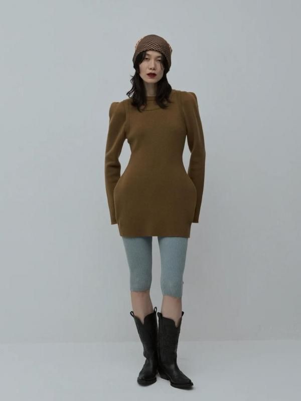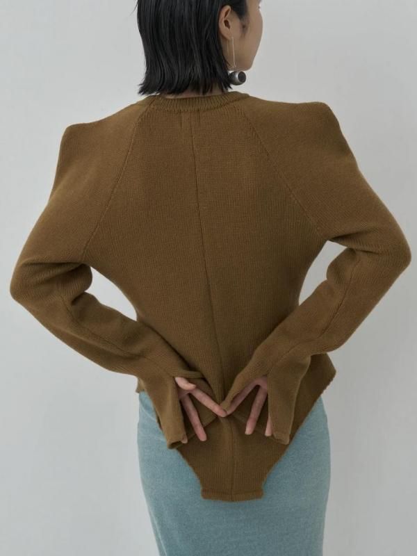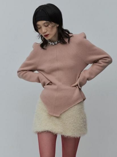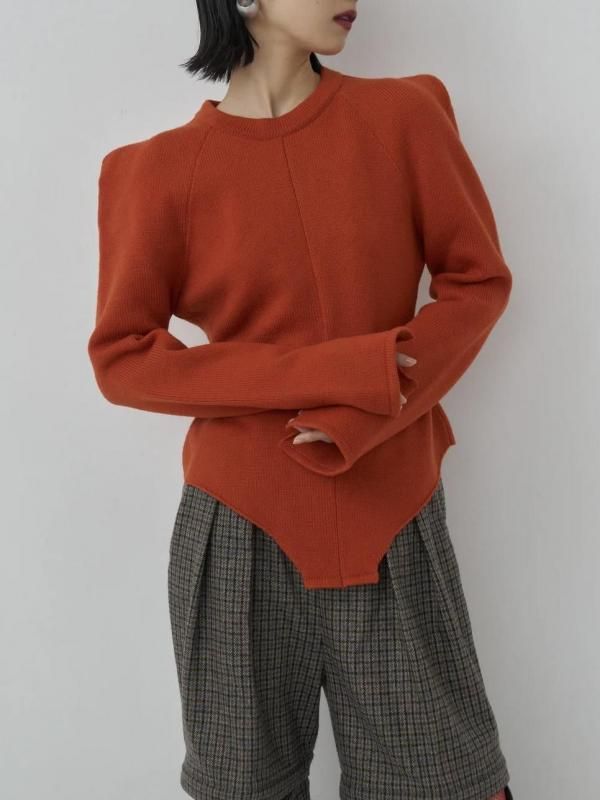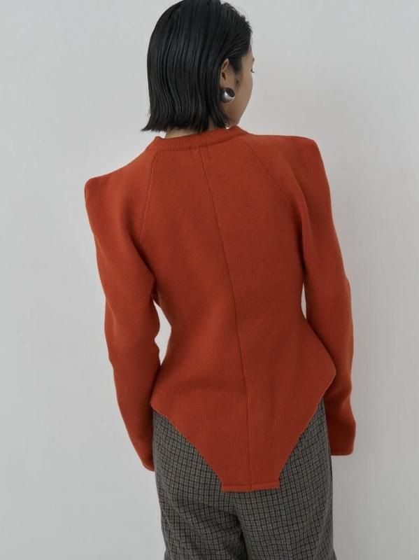 迫り上がったショルダーラインと、ボディースーツを思わせる裾のカッティングデザインで程よいモード感に。